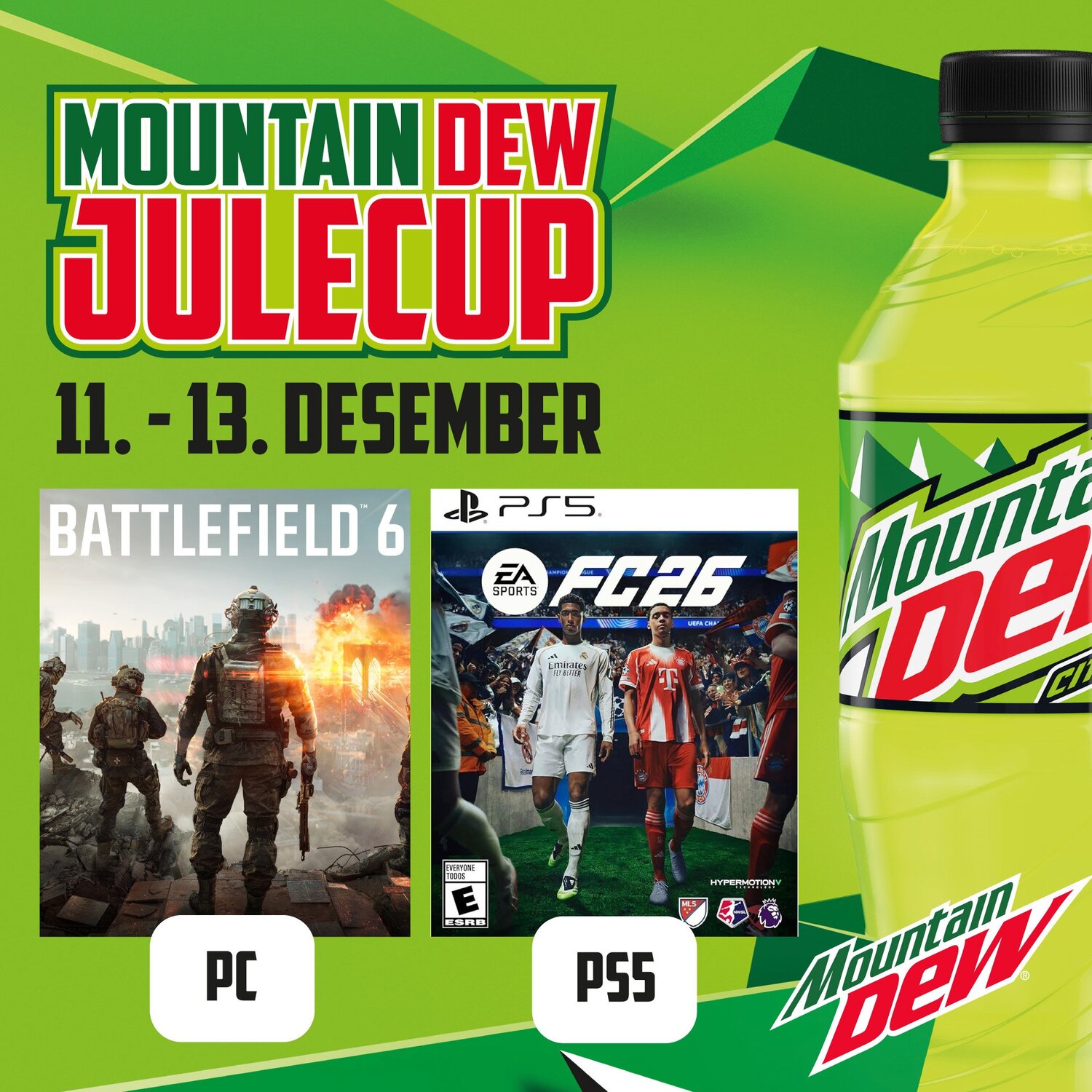 Mountain Dew inviterer til tre dager med gaming, fete premier og topp stemning 11.-13.des! Det blir action på både PC og PlayStation 5 med Battlefield 6 og EAFC 26!